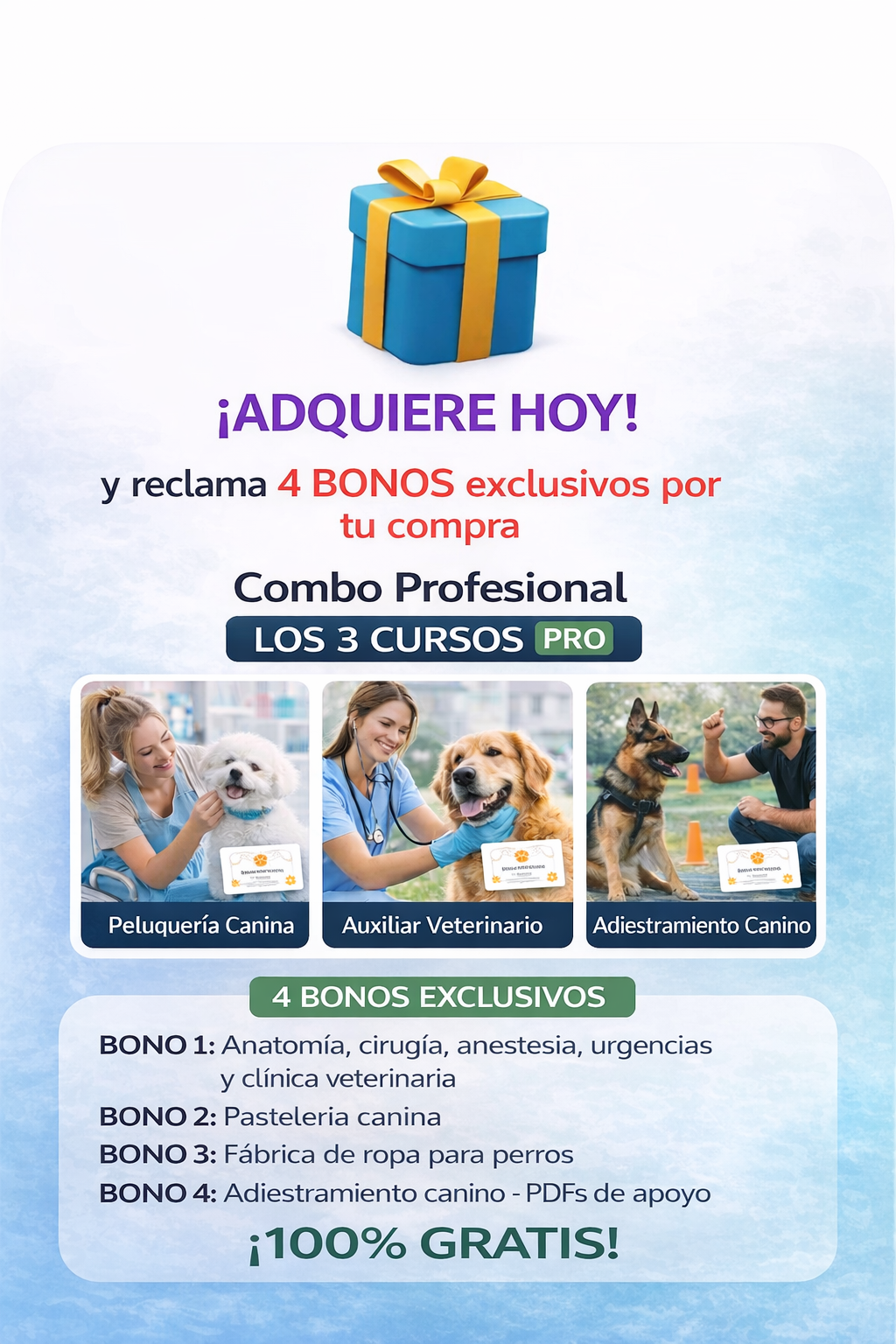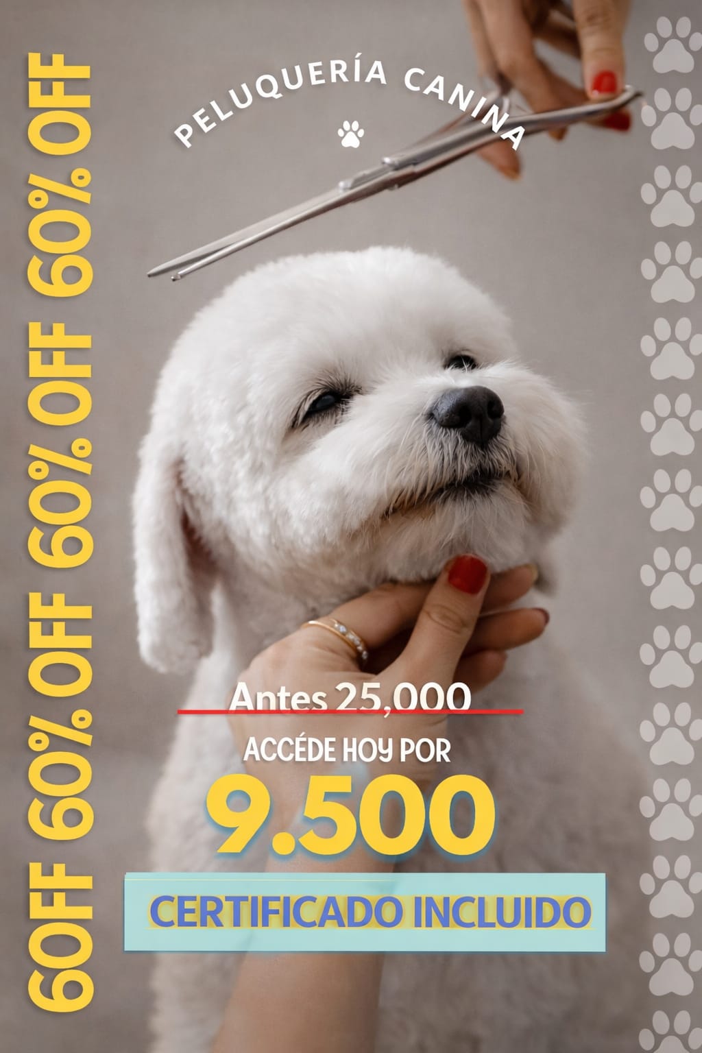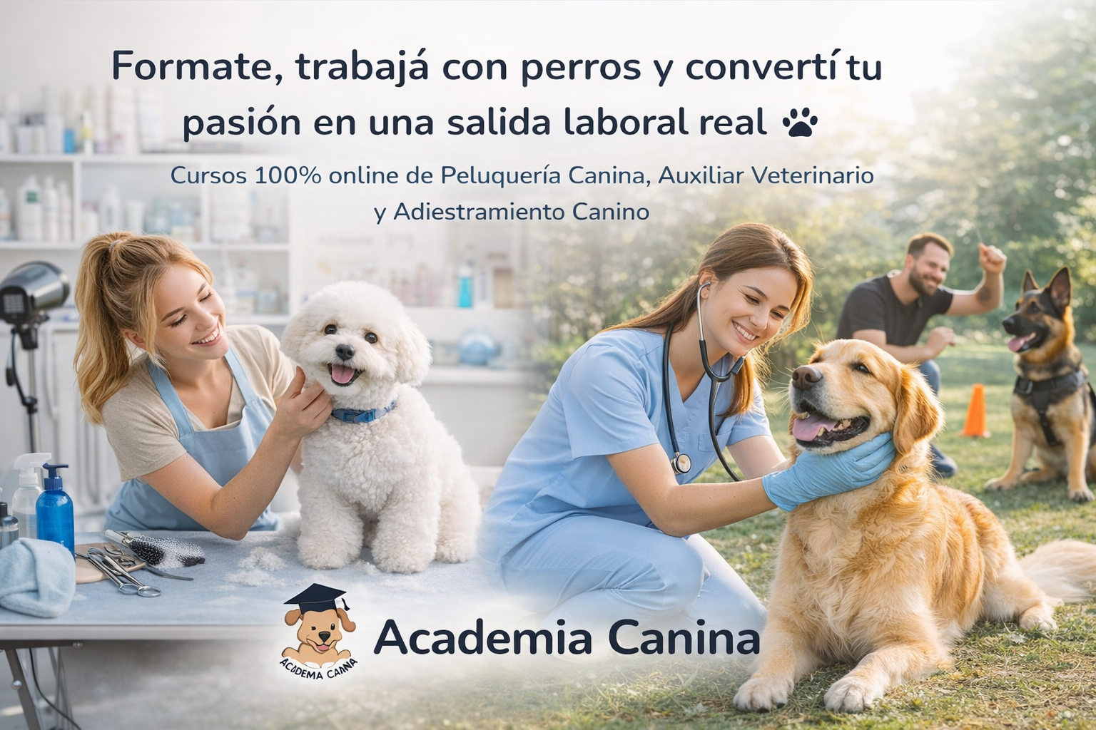 Cursos 100% online en Peluquería Canina, Auxiliar Veterinario y Adiestramiento Canino, pensados para que aprendas desde cero y empieces a generar ingresos en el rubro canino.
